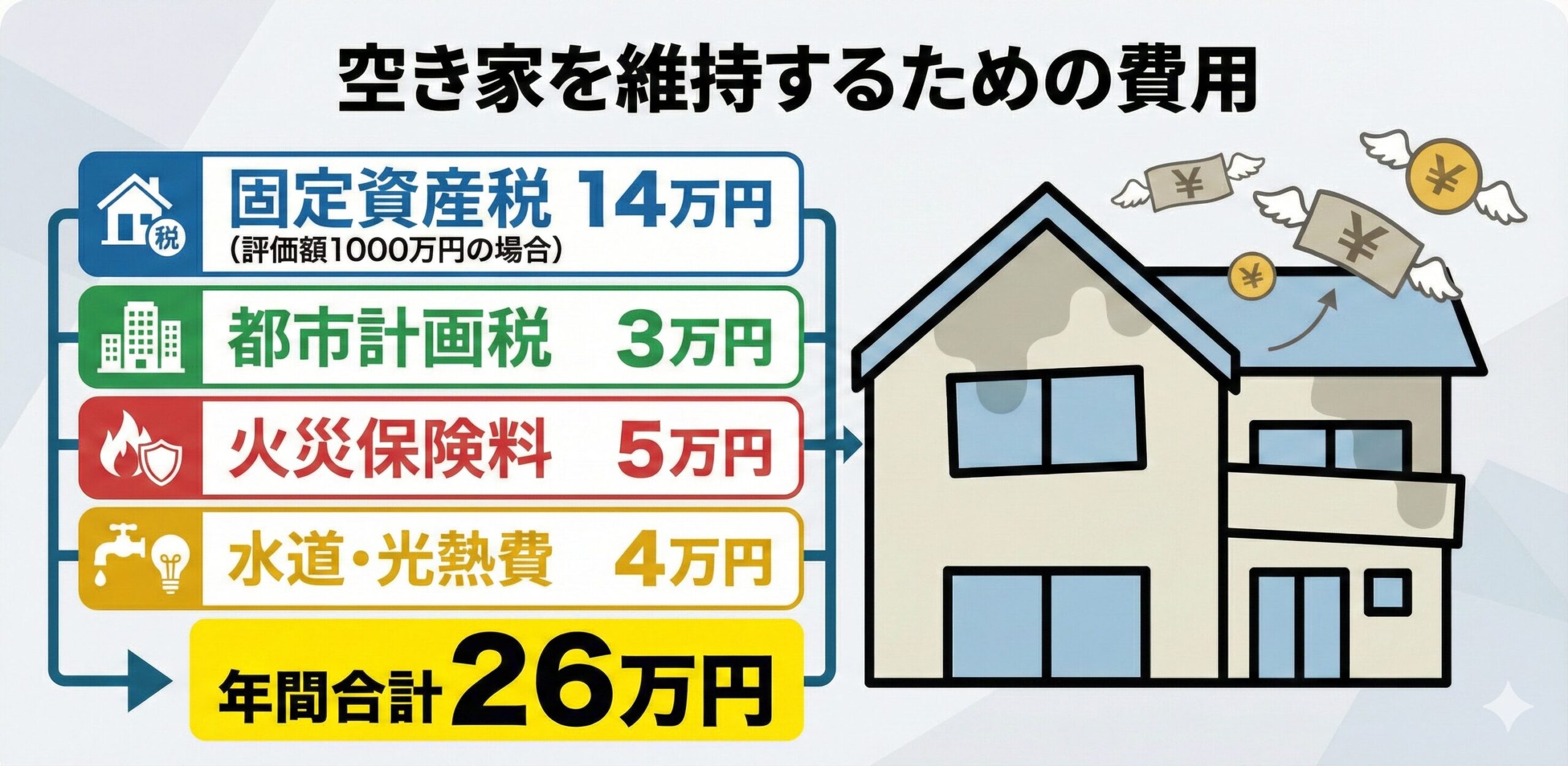 空き家は所有しているだけでこれだけの費用が掛かってきます。