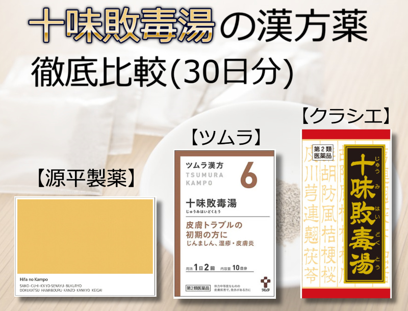 このサイトでは、湿疹などに使われる「十味敗毒湯」の漢方薬で有名な3種類を比較してご紹介。【源平製薬】【ツムラ】【クラシエ】