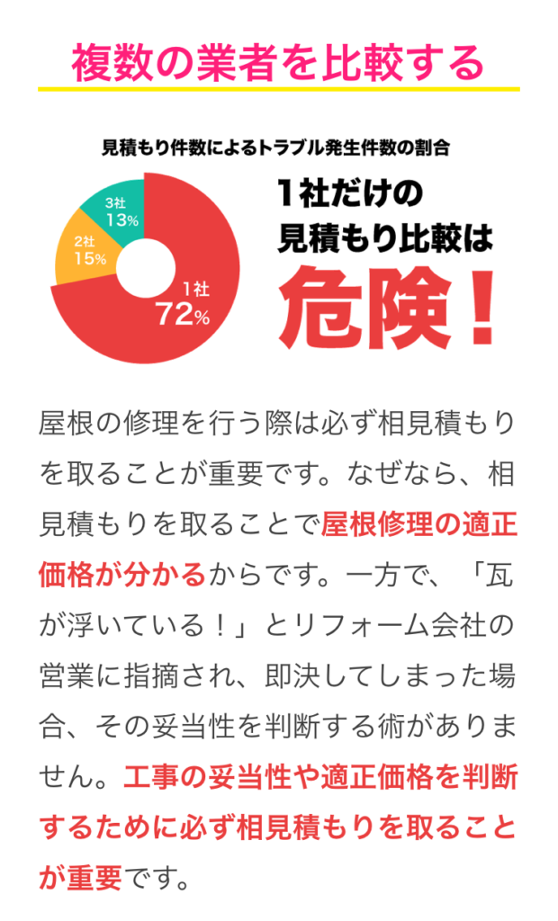 基本中の基本ですが、施工内容、価格の比較など、業者が本当に妥当な金額を提示しているか知る為にも相見積もりは絶対に必要と言えます。