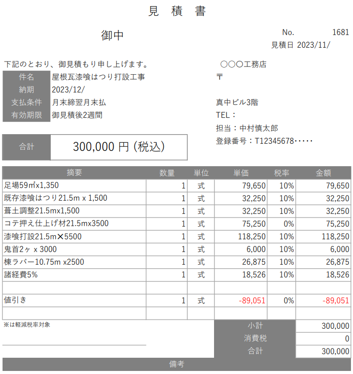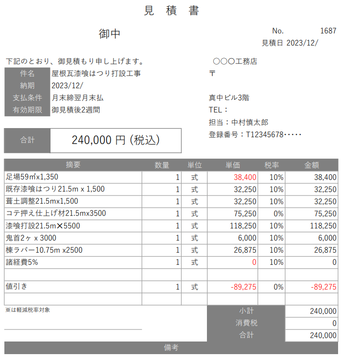 実際に漆喰の補修で、業者間の相見積もりを取った事で-60.000円値引きされた見積書をお見せします。