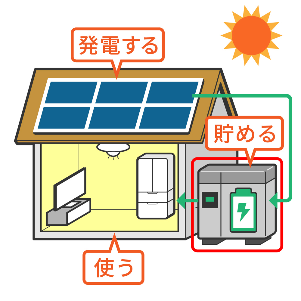 太陽光パネル🔆で発電した電気⚡を蓄電池🔋に蓄えて、必要な時に蓄えた電気を使う装置だよ。